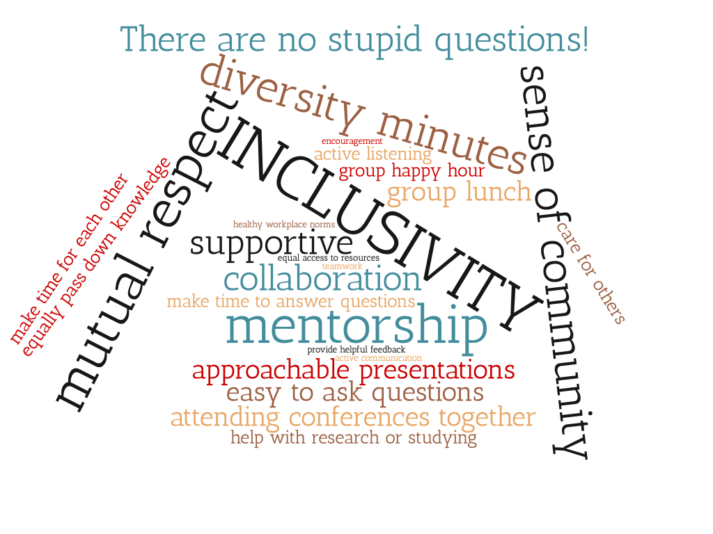 In the Neuscamman Group, we believe that scientific progress is best served when people from all groups and communities have equal access to the world of scientific research. A key component of our mission is therefore to improve inclusivity within our research area and within science more generally. Scientists are people first and individuals have unique identities that extend outside of research. We believe that this diversity is ultimately a driver of scientific excellence. Indeed, the persistent issue of under-representation in STEM is not only unjust, it also hinders innovation by limiting the perspectives brought to bear on scientific problems. It is our responsibility to act on this issue, both by fostering an inclusive group environment and by engaging in outreach initiatives within the wider community. Below you will find a word cloud summarizing what we value in our group environment, some examples of the diversity topics we discuss during group meetings, and some links to outreach activities we participate in.
